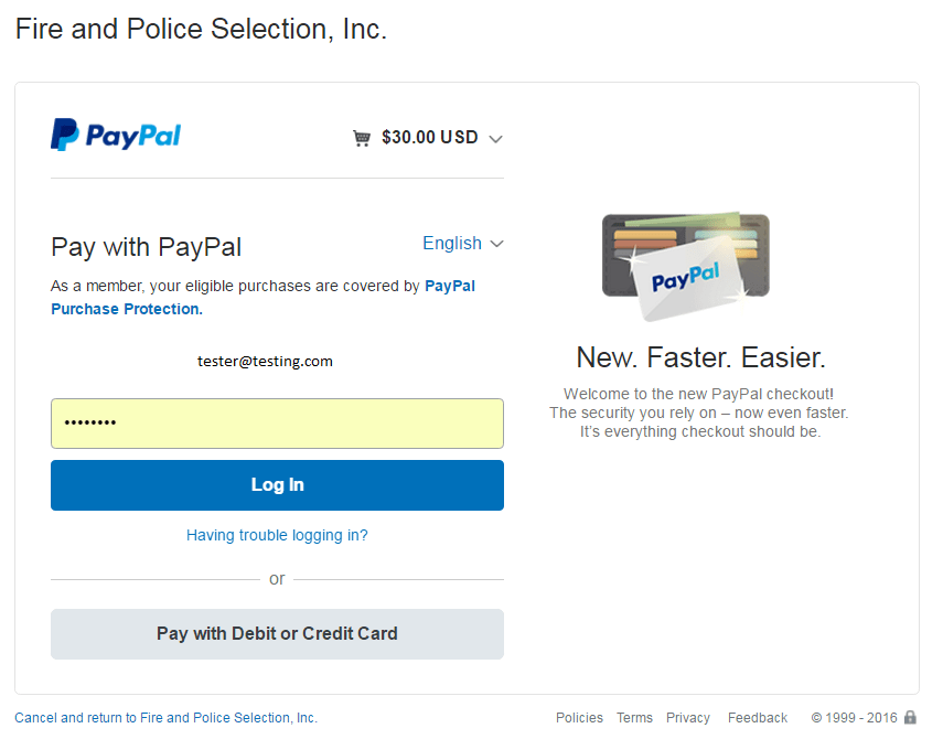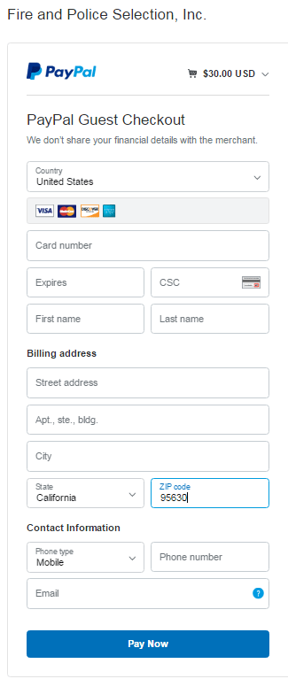 - Finally, click the “Place Order” button to be directed to the PayPal site where you will have two options for payments. 1) Log In to your account and Pay with PayPal OR 2) Checkout as guest with Pay with Debit of Credit Card.